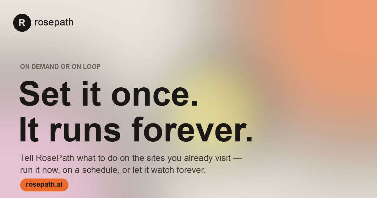 Tell RosePath what to do on the sites you already visit. Run it now, run it on a schedule, or let it watch forever — and ping you the moment something changes.